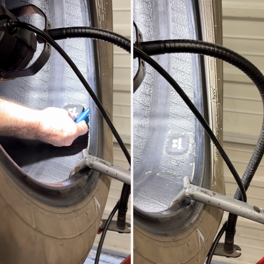 Before the tire ever comes off the wheel, we water-test it to pinpoint exactly where the air is escaping. This tells us what kind of damage we’re dealing with and helps determine whether the tire is even a candidate for repair.